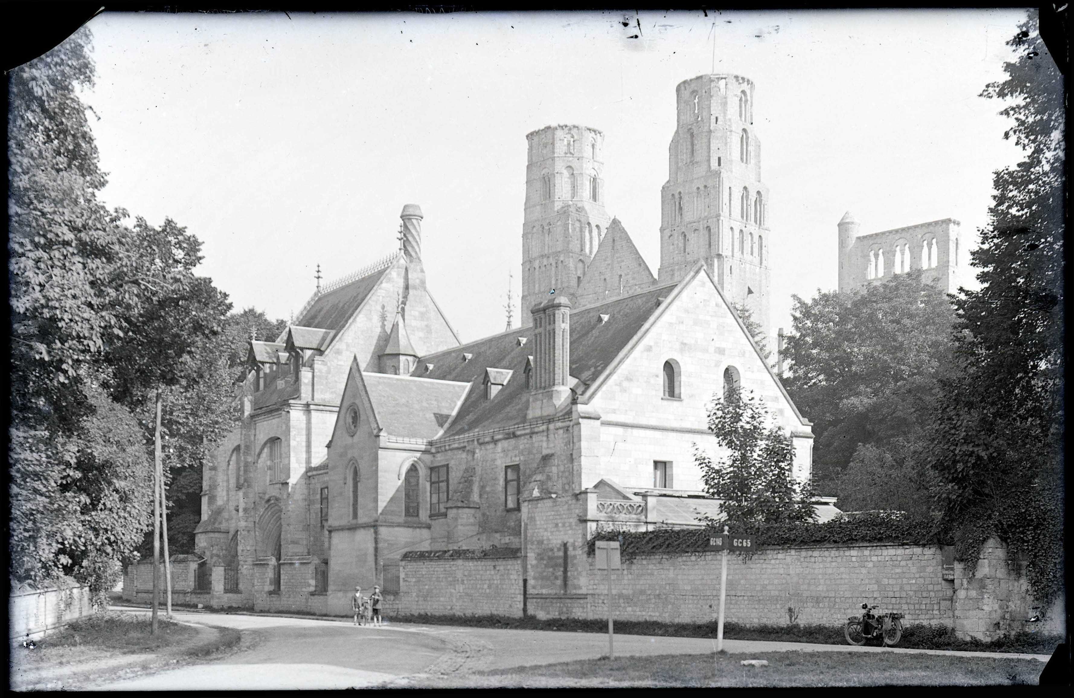 Porterie et église Notre-Dame de l'abbaye de Jumièges vues du Sud-Ouest, circa 1940