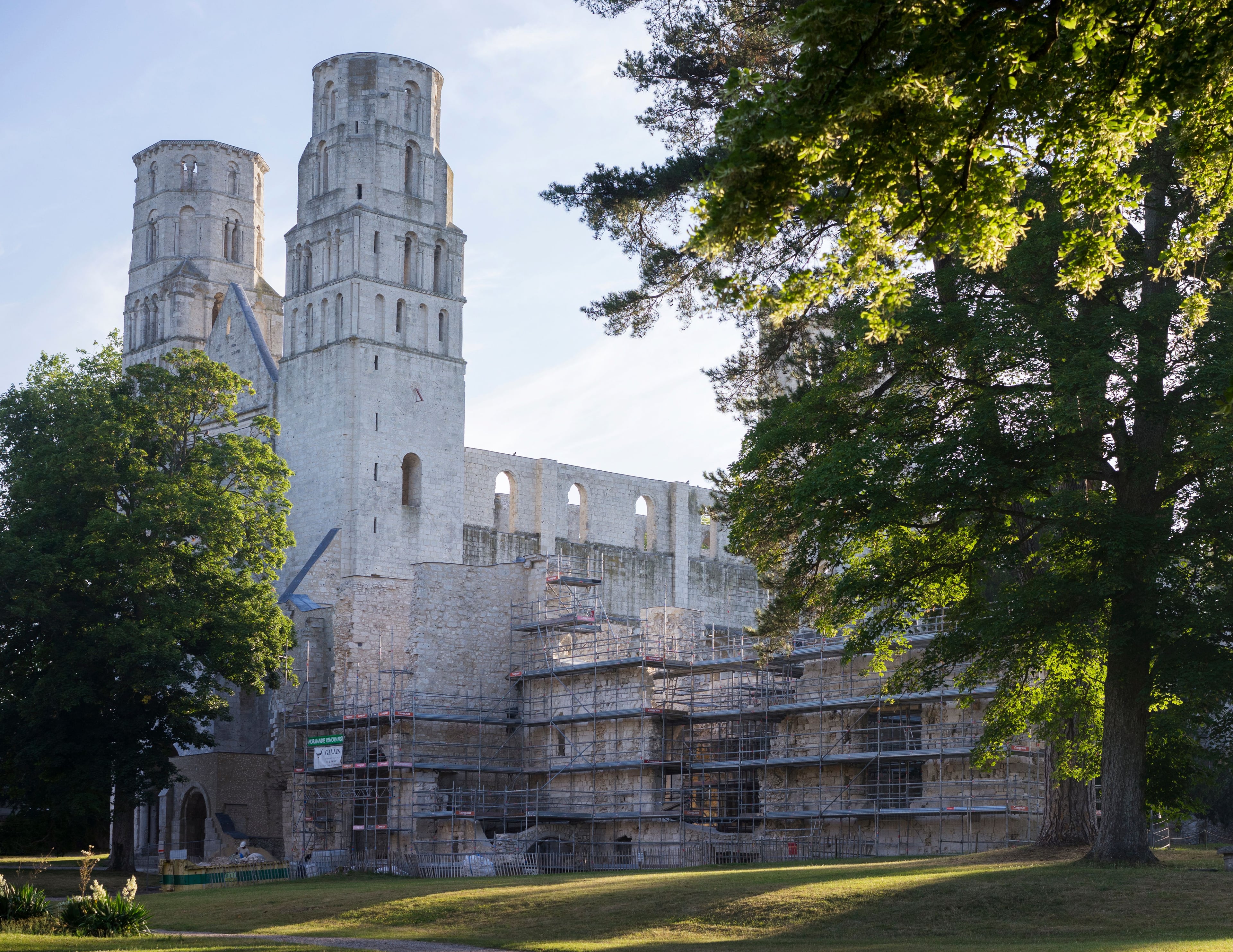 L’abbaye de Jumièges est fondée en 654 par Saint Philibert. L’histoire du site est marquée par une succession d’épisodes de démolition et de reconstruction: au raid viking de la fin du IXe siècle succède une brève période de renaissance, interrompue à la faveur de l’abbaye de Saint-Ouen. La dédicace de l’église Notre-Dame en 1067 a lieu en présence de Guillaume le Conquérant, nouvellement sacré duc de Normandie et roi d’Angleterre. La période de prospérité et de stabilité financière qui s’installe et se poursuit jusqu’au XIVe siècle est ébranlée par la guerre de Cents Ans et des révoltes paysannes. Les XVIIe et XVIIIe siècles sont marqués par l’accomplissement des travaux des Mauristes, qui dotent l’abbaye de Jumièges d’un nouveau logis abbatial. Au sortir de la Révolution, l’abbaye devient bien national: elle est vendue et démembrée, avant de susciter un nouvel intérêt sous l’impulsion romantique. En 1835 Victor Hugo qualifie l’abbaye de Jumièges de «plus belle ruine de France».
