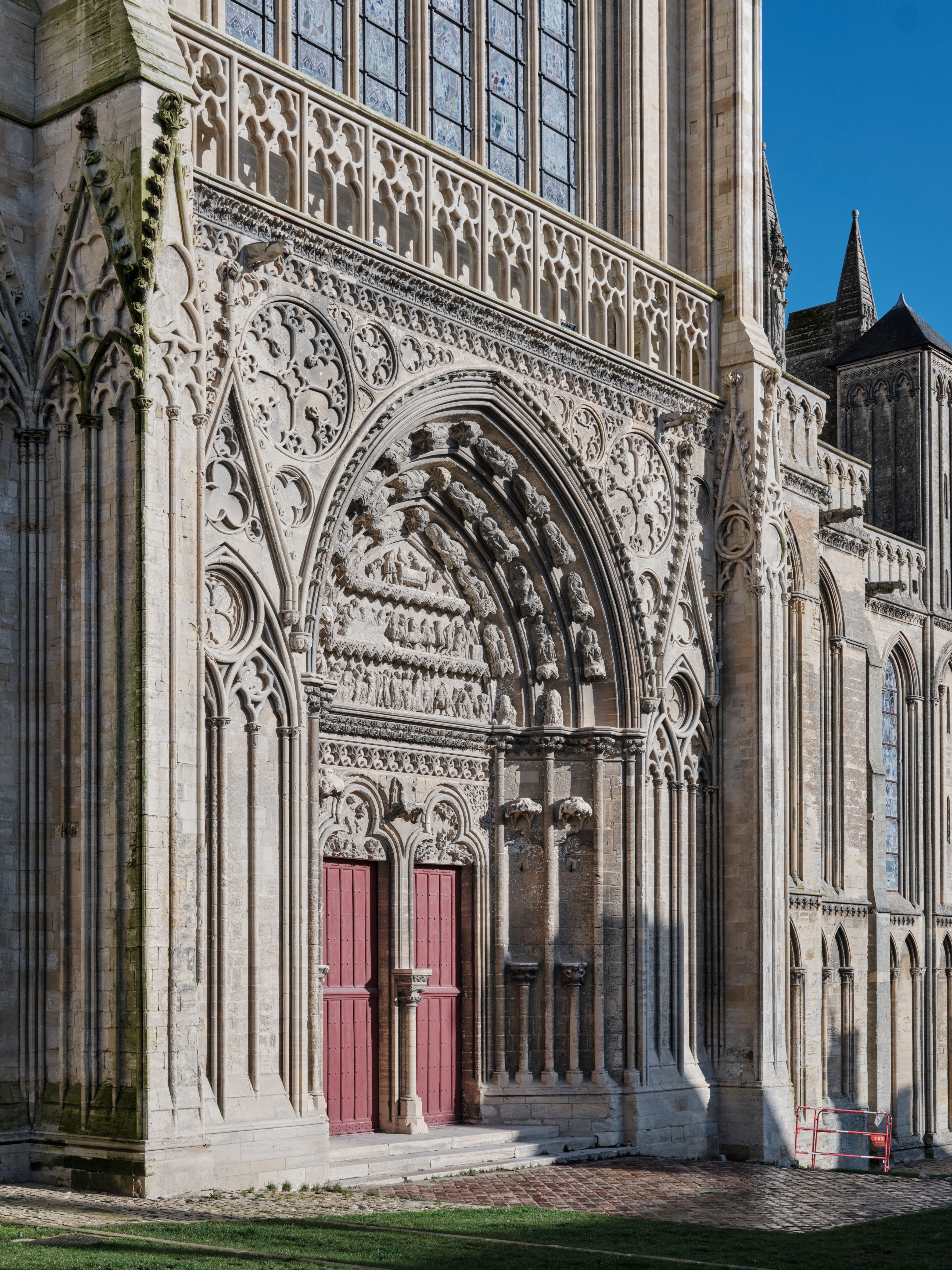 La cathédrale de Bayeux dispose de quatre portails historiés remarquables: trois sur la façade occidentale relatant la Passion du Christ et le Jugement dernier et le quatrième sur celle du bras de transept Sud. À l’Ouest, seuls les portails Nord et Sud ont conservé leur décor gothique des années 1260, le portail central a été amplement modifié en 1778. Vidé de ses sculptures, il a désormais son tympan percé d’un oculus. Le bras de transept Sud s’ouvre par le portail du doyen dont l’hôtel est situé en face. Son tympan est dédié au martyre de saint Thomas Becket. Ces portails n’ont pas connu de restauration depuis les importants travaux de la seconde moitié du XIXe siècle. Ils sont aujourd’hui en mauvais état et nécessitent une intervention précise, notamment sur leurs sculptures, en majeure partie originelles.