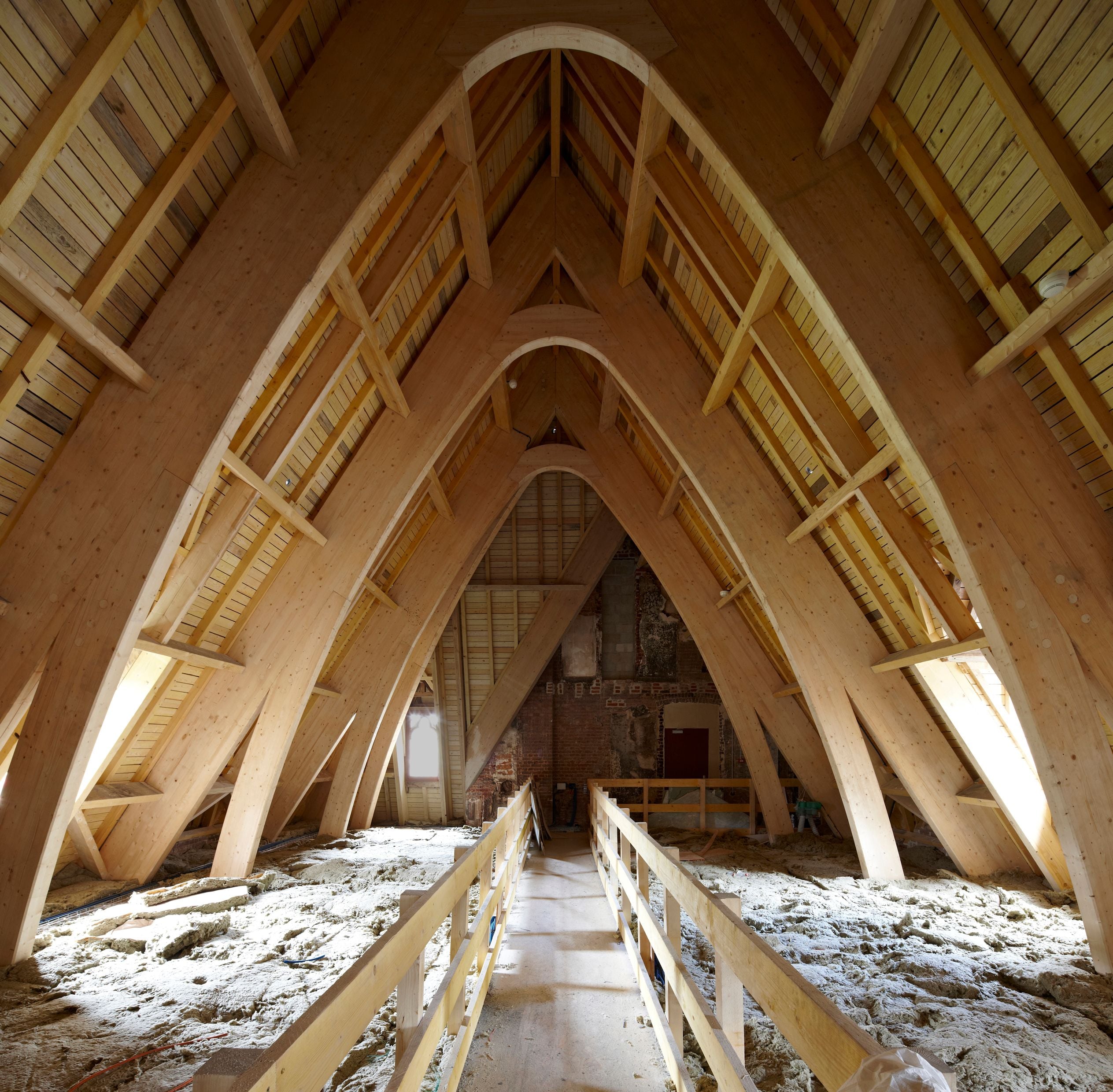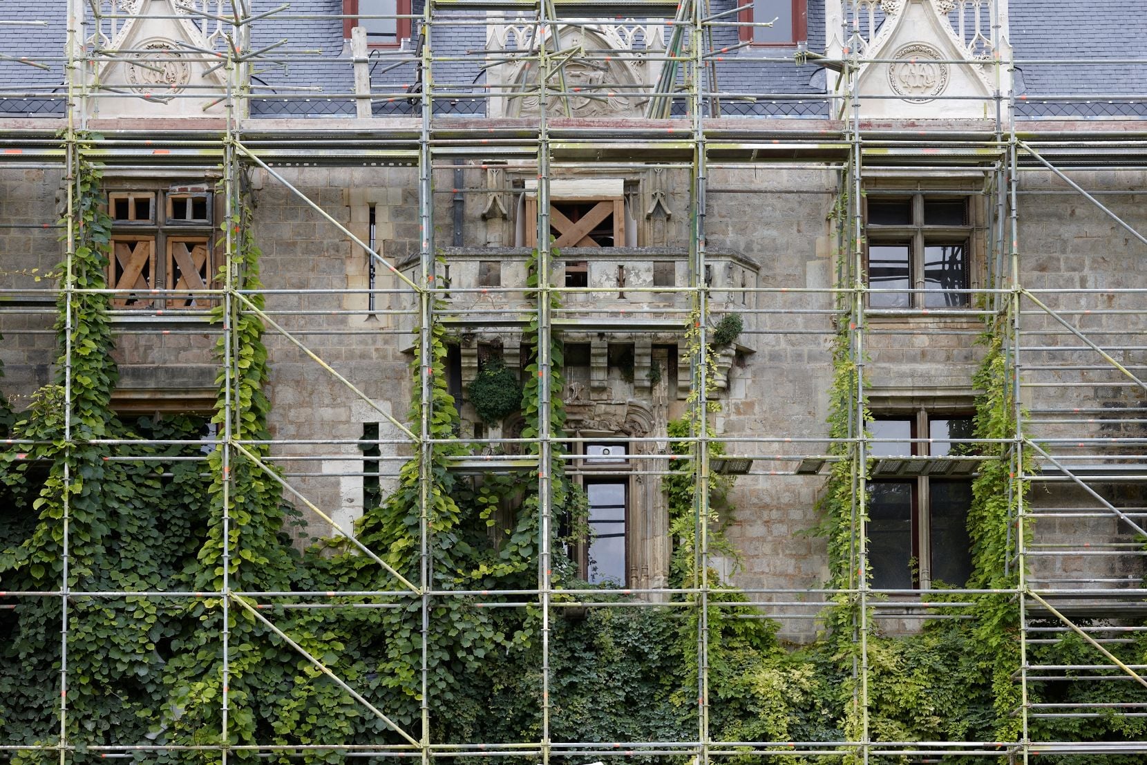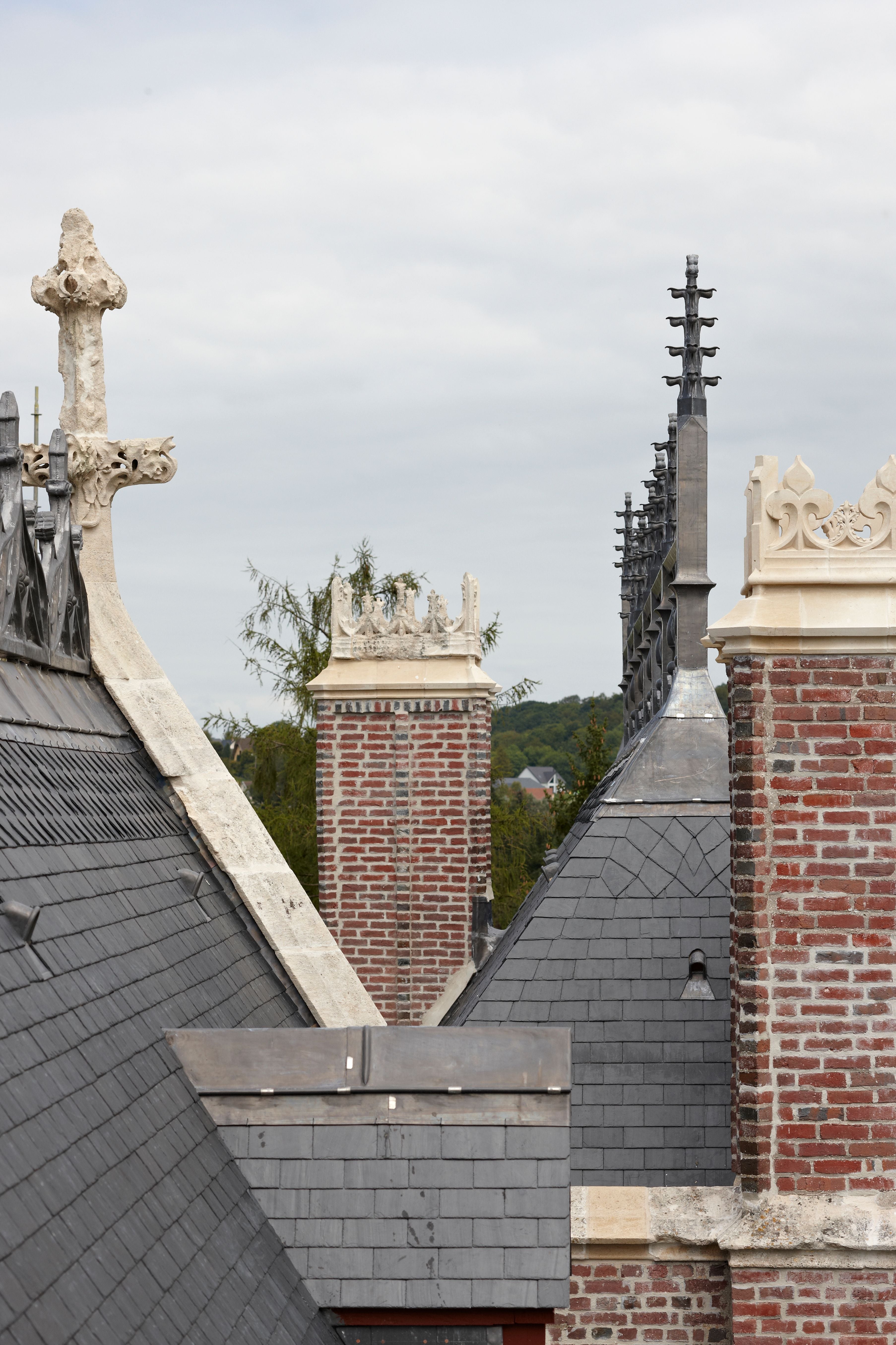 Les charpentes et couvertures du château endommagées par un incendie en 1939 n’ont connu que des réparations de fortune. Afin de pouvoir adapter le patrimoine et le faire évoluer vers de nouvelles demandes, l’agence propose une charpente neuve en lamellé collé pour le côté Est permettant de libérer le volume des combles jusqu’alors difficilement aménageable. Cette proposition permet de restaurer l’édifice tout en laissant une porte ouverte à la programmation future du lieu – accueil du public, espaces d’expositions et accueil de séminaires – autant d’activités qui pourront assurer le renouvellement d’un fond budgétaire d’entretien. La réinterprétation du comble devenu espace utile est une manière positive d’envisager l’évolution du patrimoine sans pour autant modifier sa composition d’ensemble.
