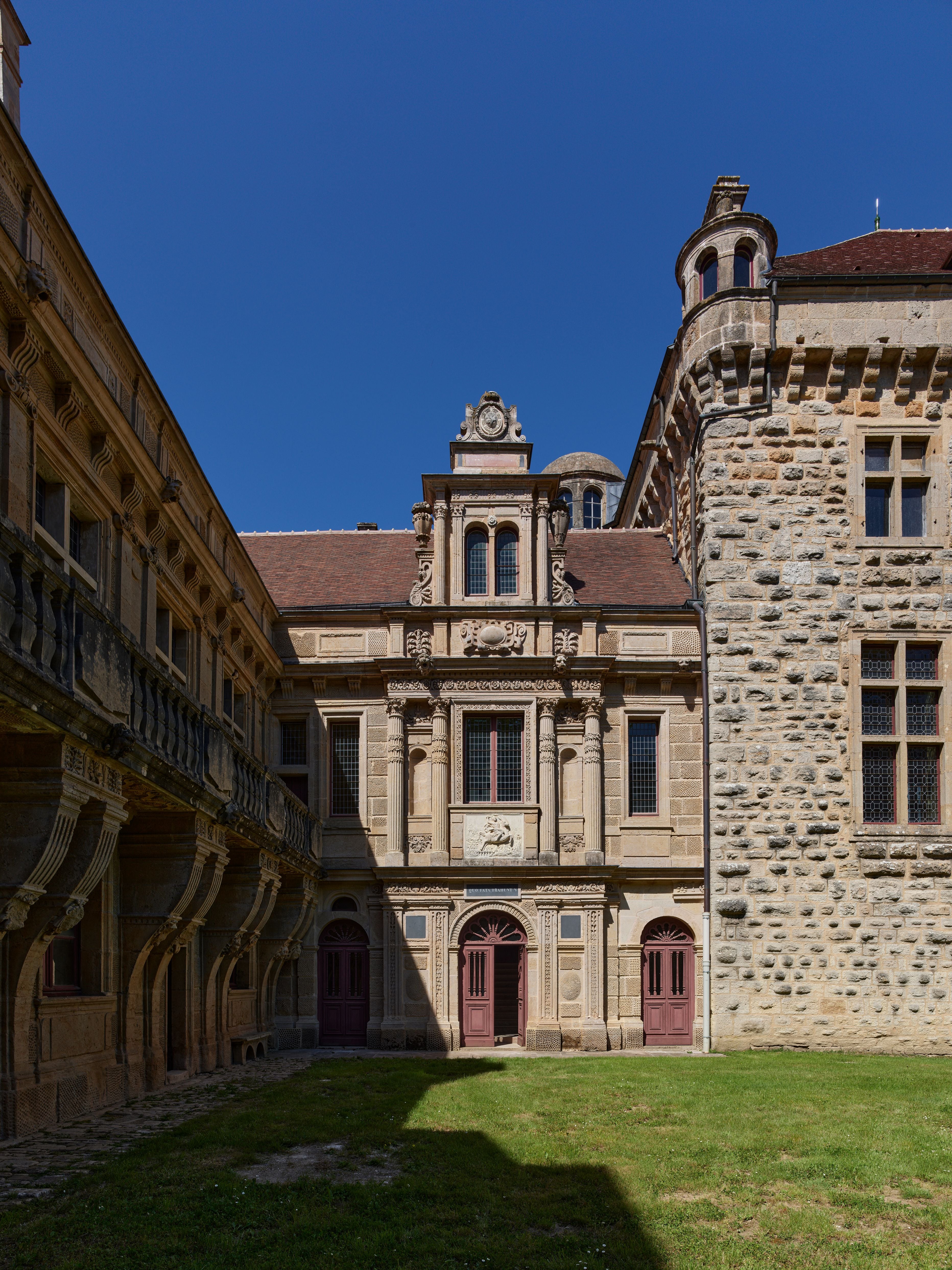 Détail de l'entrée sur cour et du donjon du château du Pailly, 2020