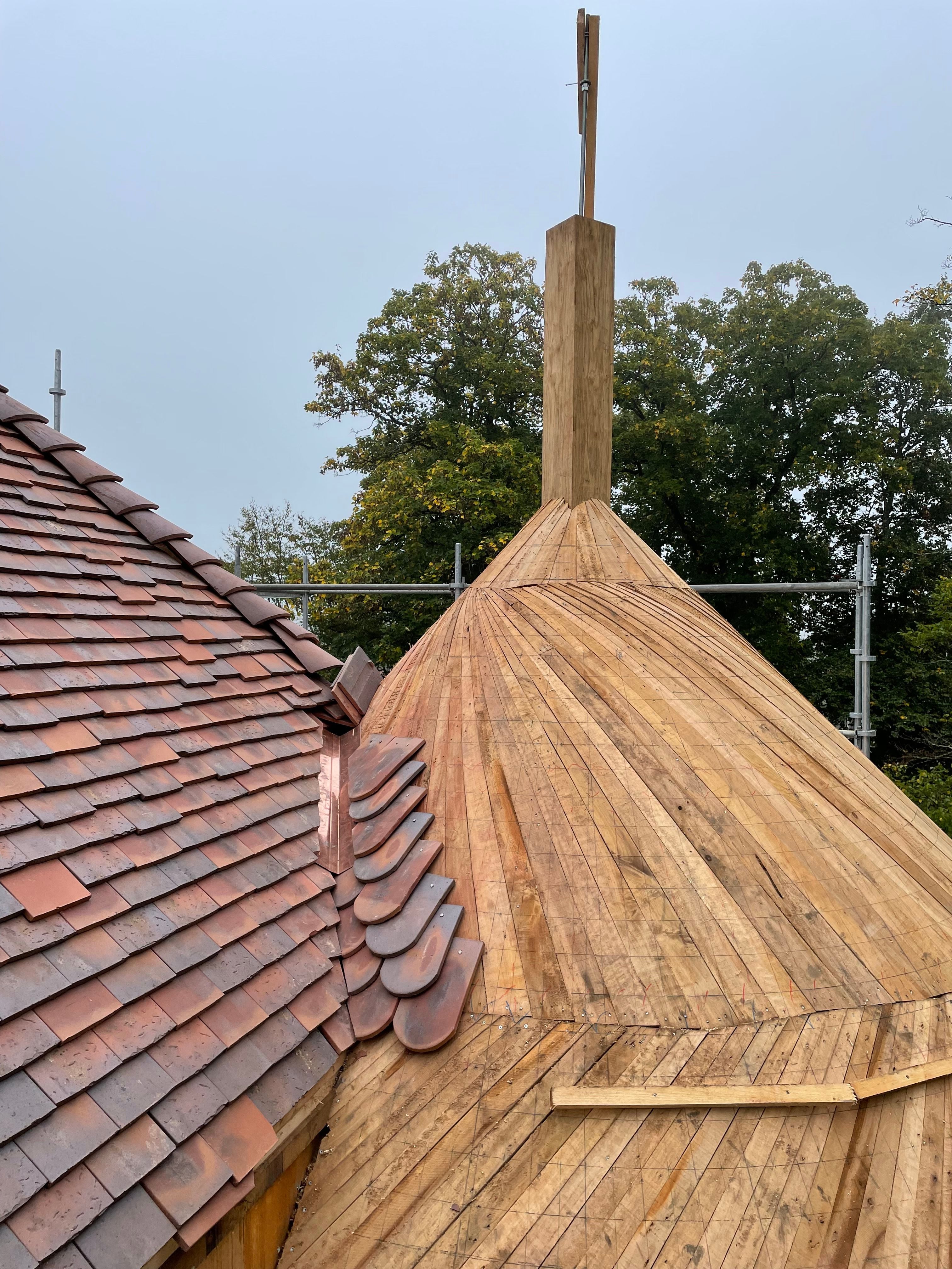 Couverture de la tour Sud-Est du château du Pailly, chantier de restauration en cours, 2022