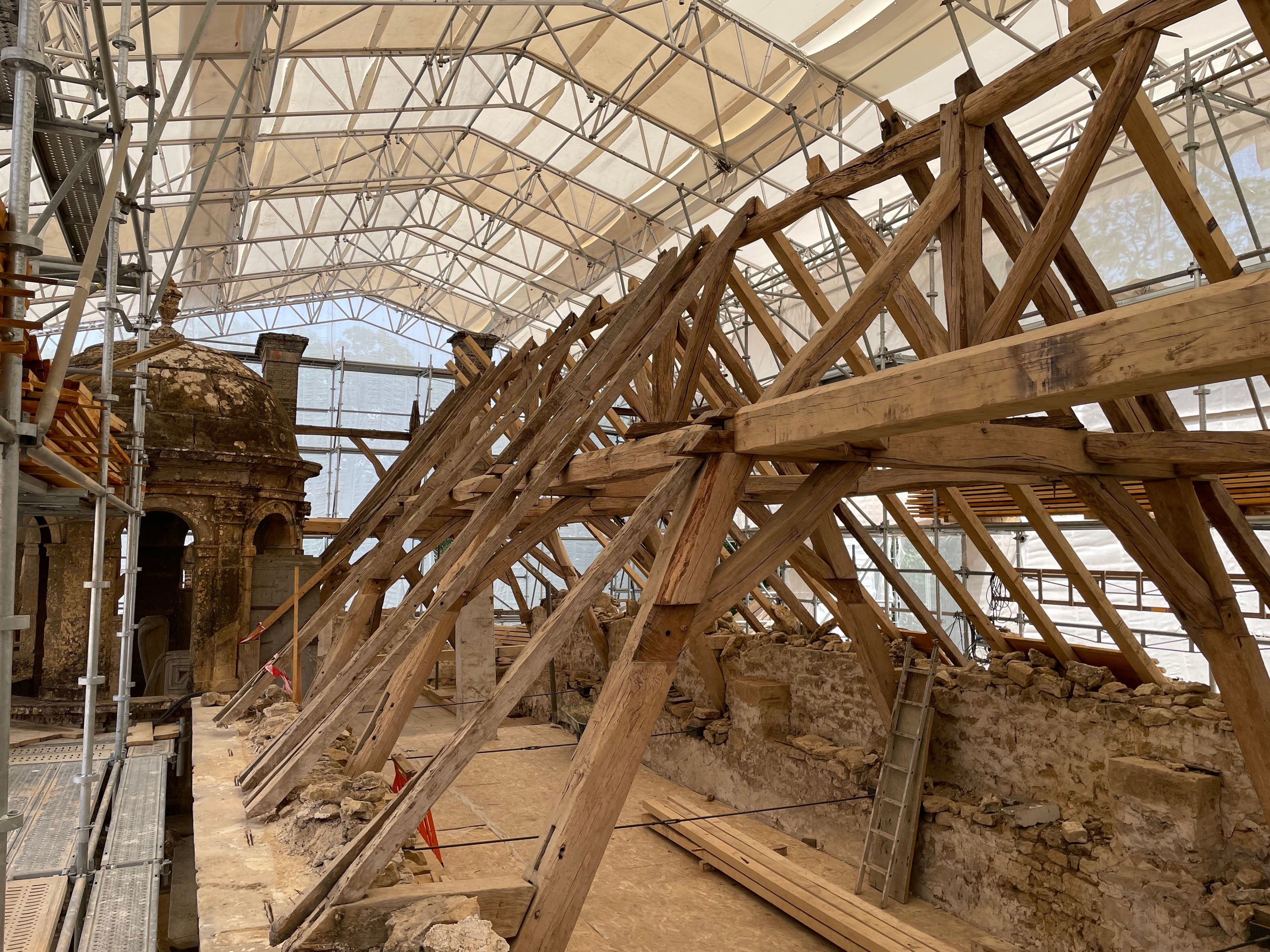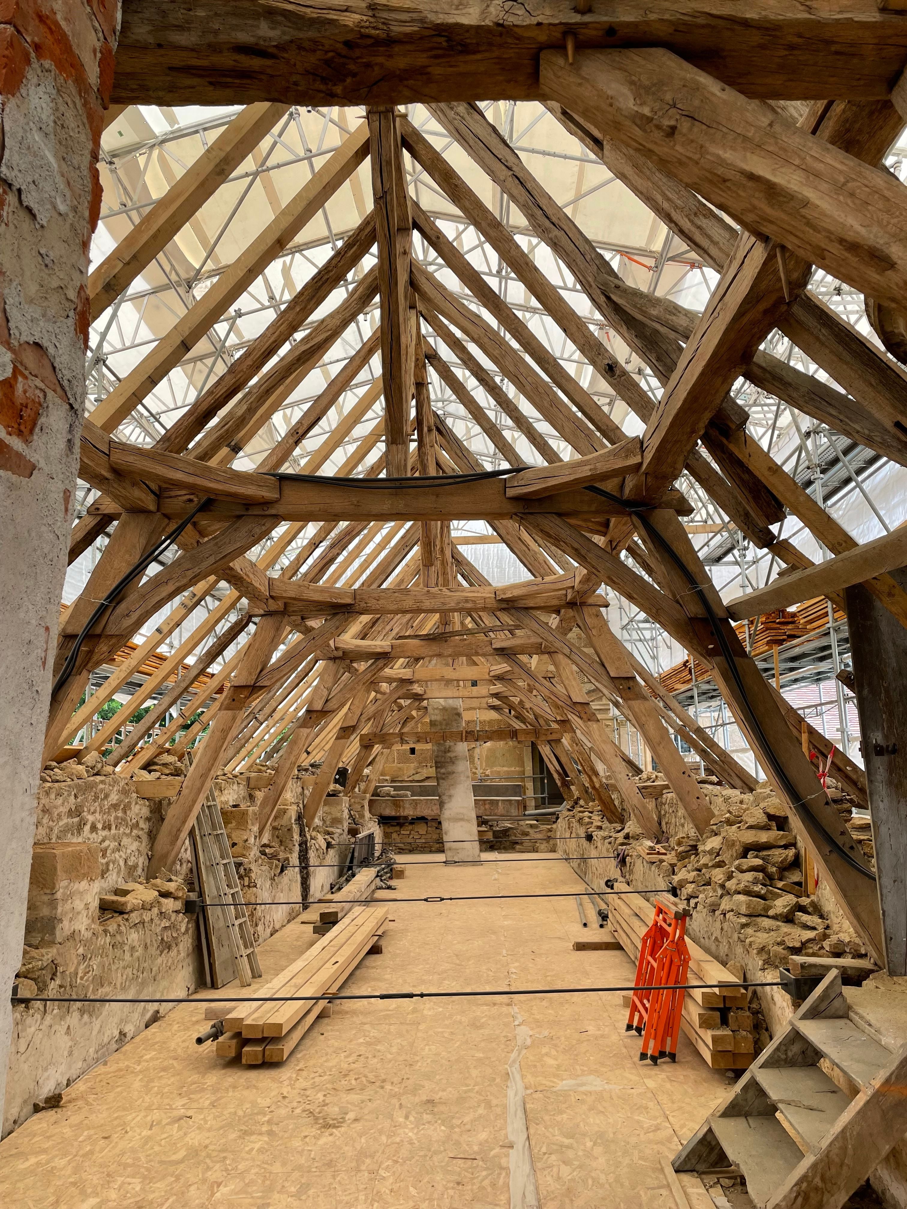 Charpente de l'aile Sud du château du Pailly, chantier de restauration en cours, 2022