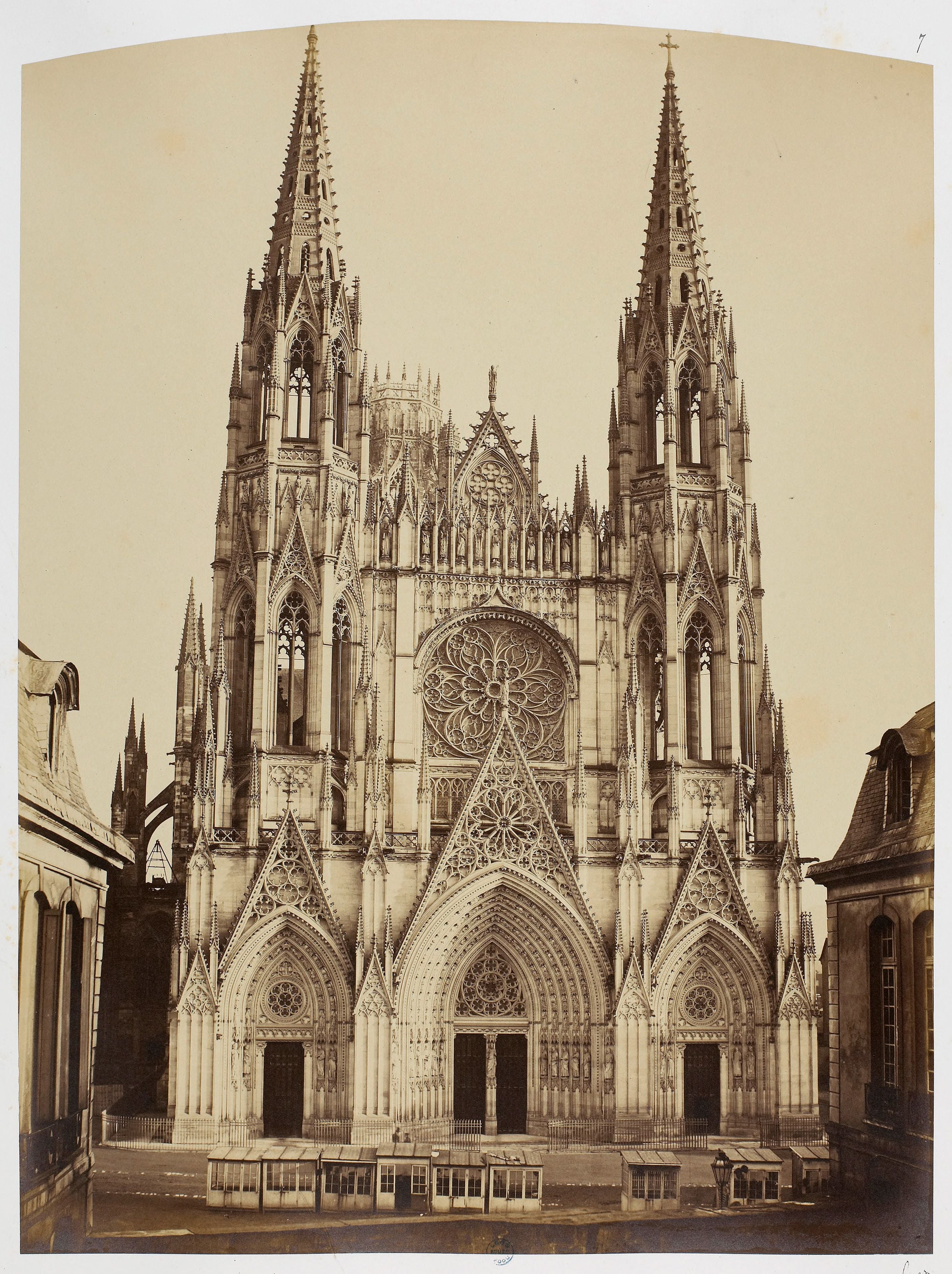 L’histoire de l’église abbatiale de Saint-Ouen remonte au VIIe siècle: trois églises ont été successivement édifiées sur ce même site. Un premier édifice est érigé à l’emplacement de la chapelle funéraire de Saint Ouen, évêque de Rouen entre 641 et 648. L’abbaye bénédictine qui s’y développe ensuite est mise à mal par l’invasion des vikings en 841. L’église est restaurée, puis remplacée par un nouvel édifice construit entre 1056 et 1126, touché par l’incendie qui se déclare à Rouen en 1136. Le site restauré est de nouveau endommagé par un incendie en 1248. Cet événement occasionne la reconstruction partielle de l’abbaye. Le chevet s’effondre peu avant 1318. Marc d’Argent, alors abbé de Saint-Ouen, décide de faire édifier une nouvelle église. De l’ancienne église romane, seule la Tour aux Clercs est conservée. Les travaux – interrompus par la guerre de Cent ans qui diminuent les recettes de l’abbaye – se poursuivent jusqu’en 1549. Toutefois, la façade occidentale restera inachevée jusqu’à 1840 où un ambitieux projet conçu au nom de l’unité de style et emblématique des premières réflexions sur la restauration des Monuments Historiques est mis en œuvre.