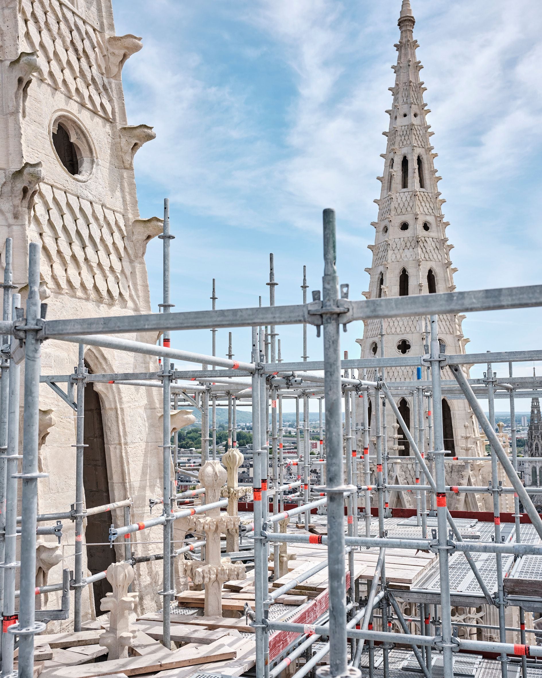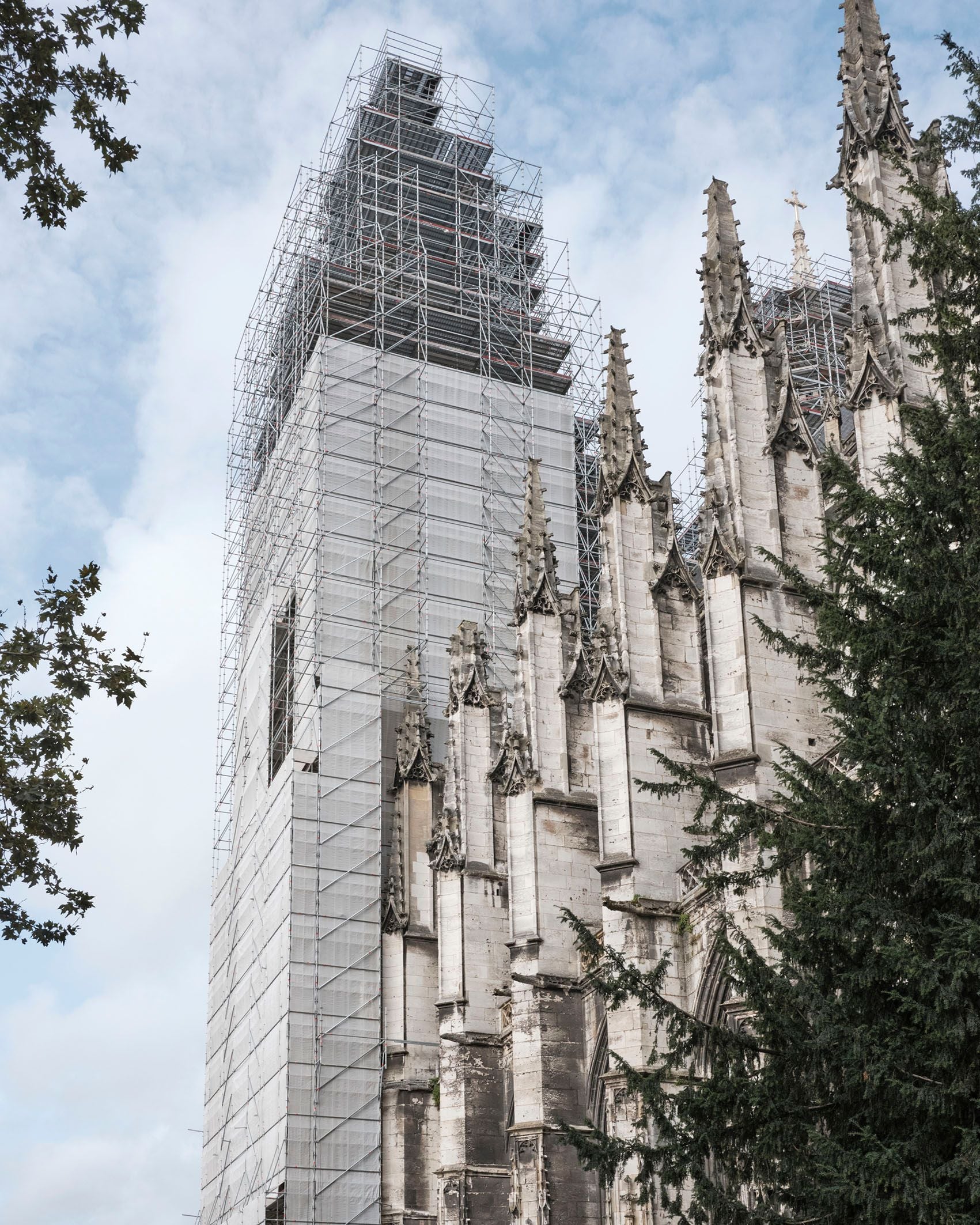 Tour Sud du massif occidental de l'abbatiale Saint-Ouen de Rouen échafaudée, 2023