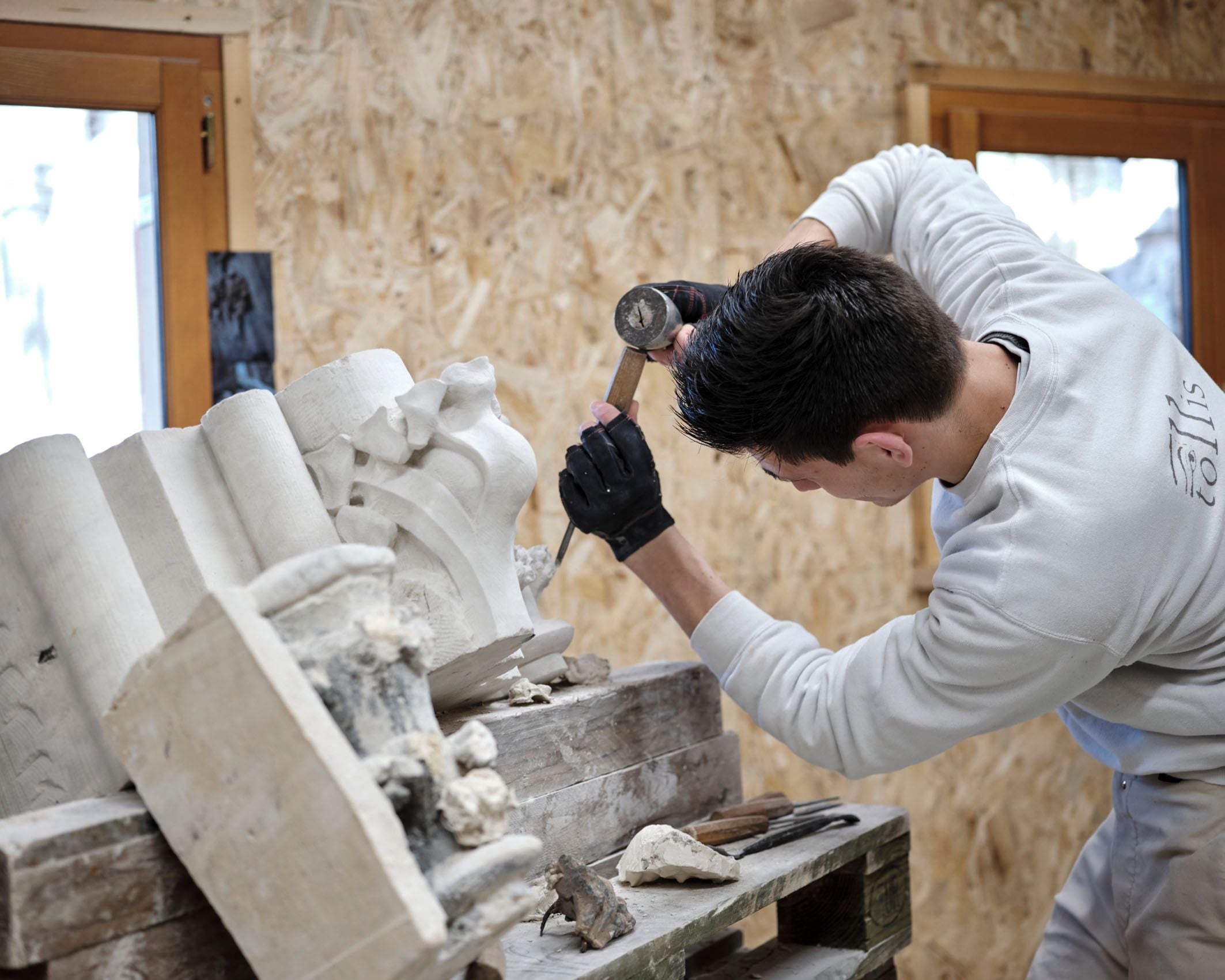 Sculpture d'ornements de la façade du bras de transept Sud de l'abbatiale Saint-Ouen de Rouen, 2023