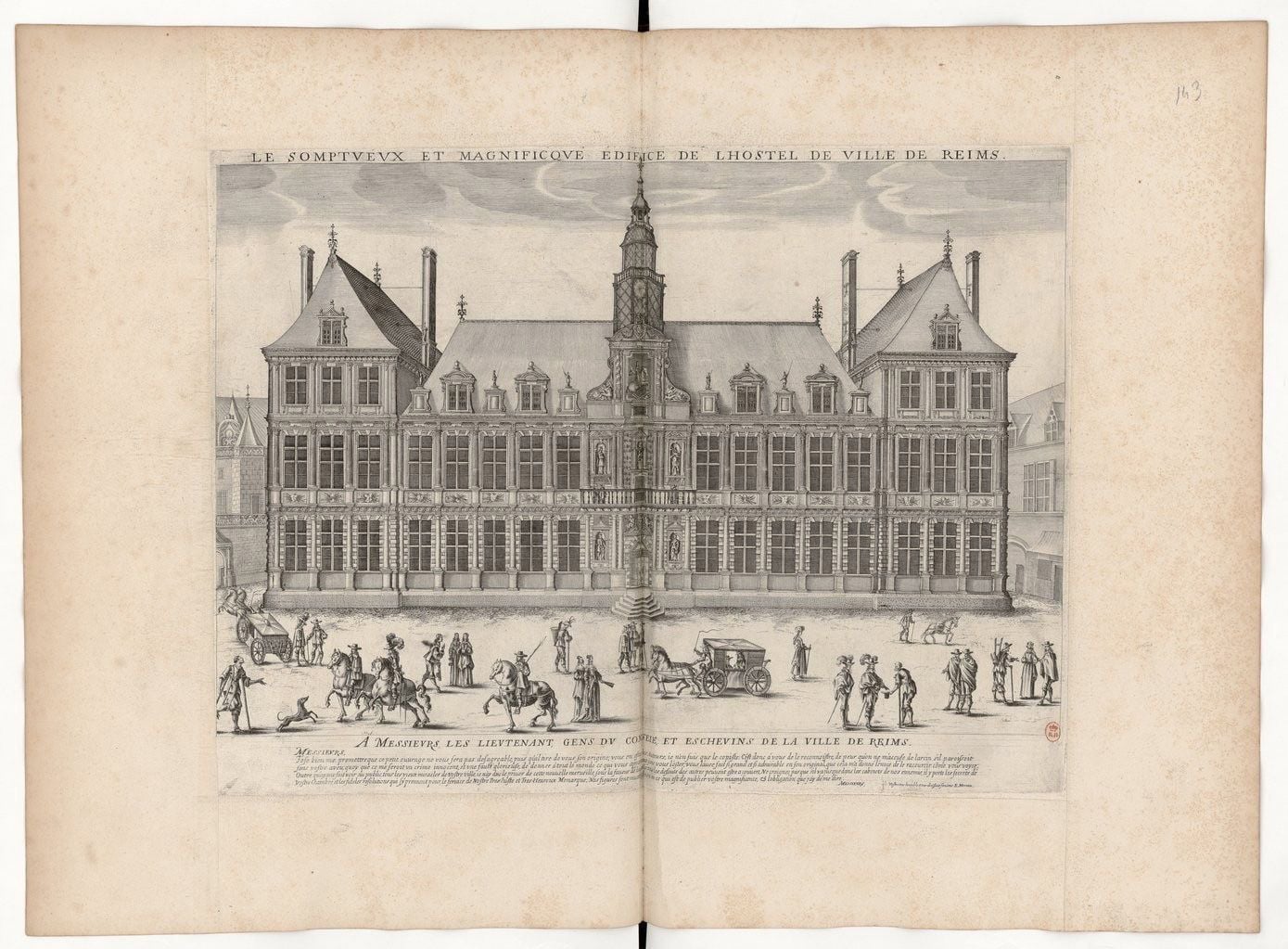 L’Hôtel de Ville de Reims est construit en plusieurs campagnes de travaux, entre le XVIIe et la seconde moitié du XIXe siècle. Le corps central de la façade sud, le pavillon ouest et l’aile sud-ouest sont construits entre 1627 et 1634 par l’architecte Jean Bonhomme. Cette belle façade ordonnancée, symétrique autour d’un corps central surmonté d’un remarquable campanile, n’est achevée qu’entre 1822 et 1825 par l’architecte de la Ville M. Serrurier, conformément au projet d’origine illustré par la gravure d’Edme Moreau datant de 1625. Les ailes en retour sont édifiées entre 1875 et 1880 par Narcisse Brunette.
