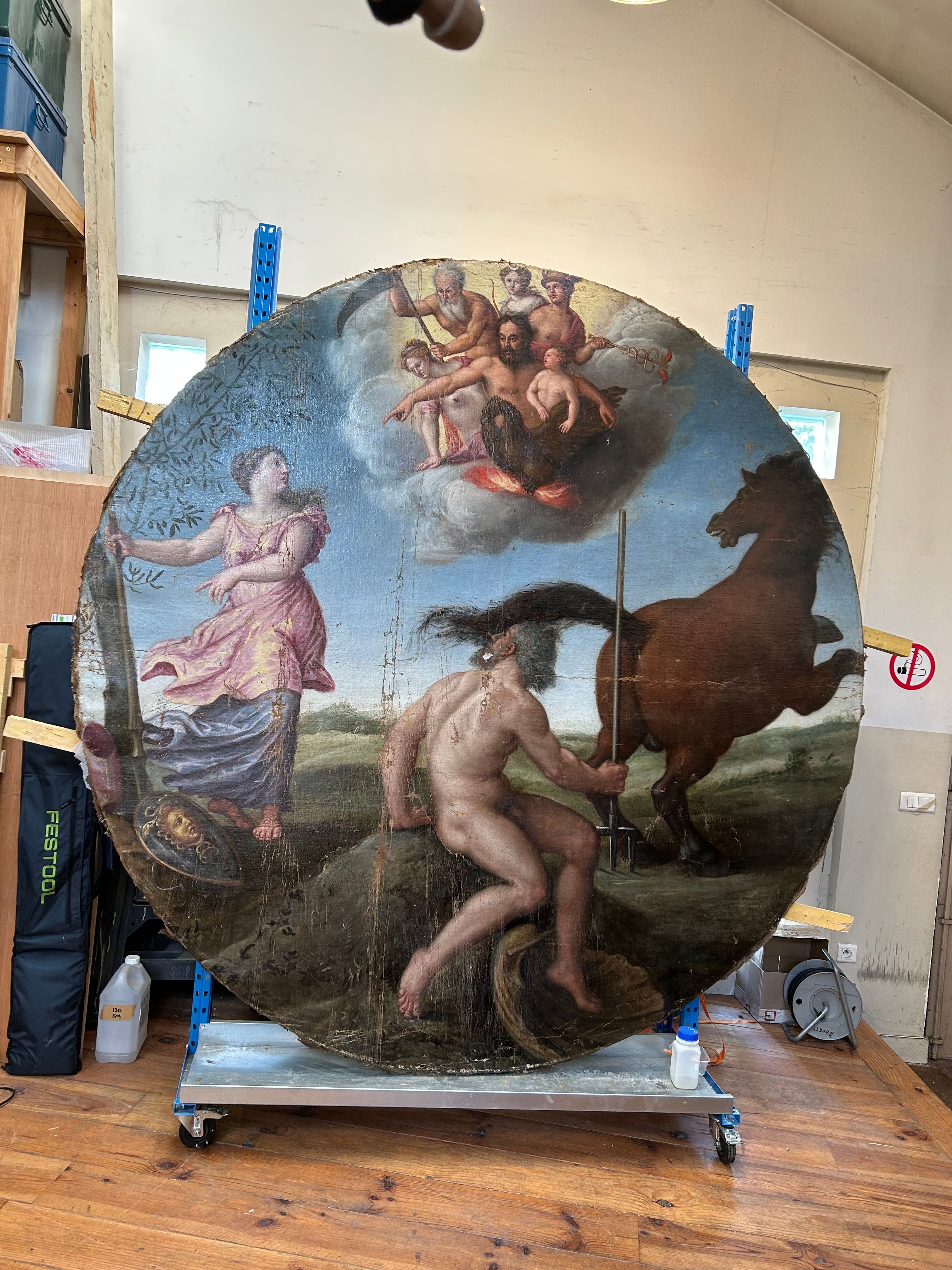 L’opération prévue dans le fumoir porte sur la restauration de l’ensemble de la pièce, dont le fabuleux plafond à tondo vénitien du XVIe siècle, et des œuvres qui y sont exposées en intégrant la mise aux normes des équipements électriques, de sécurité et d’éclairage.