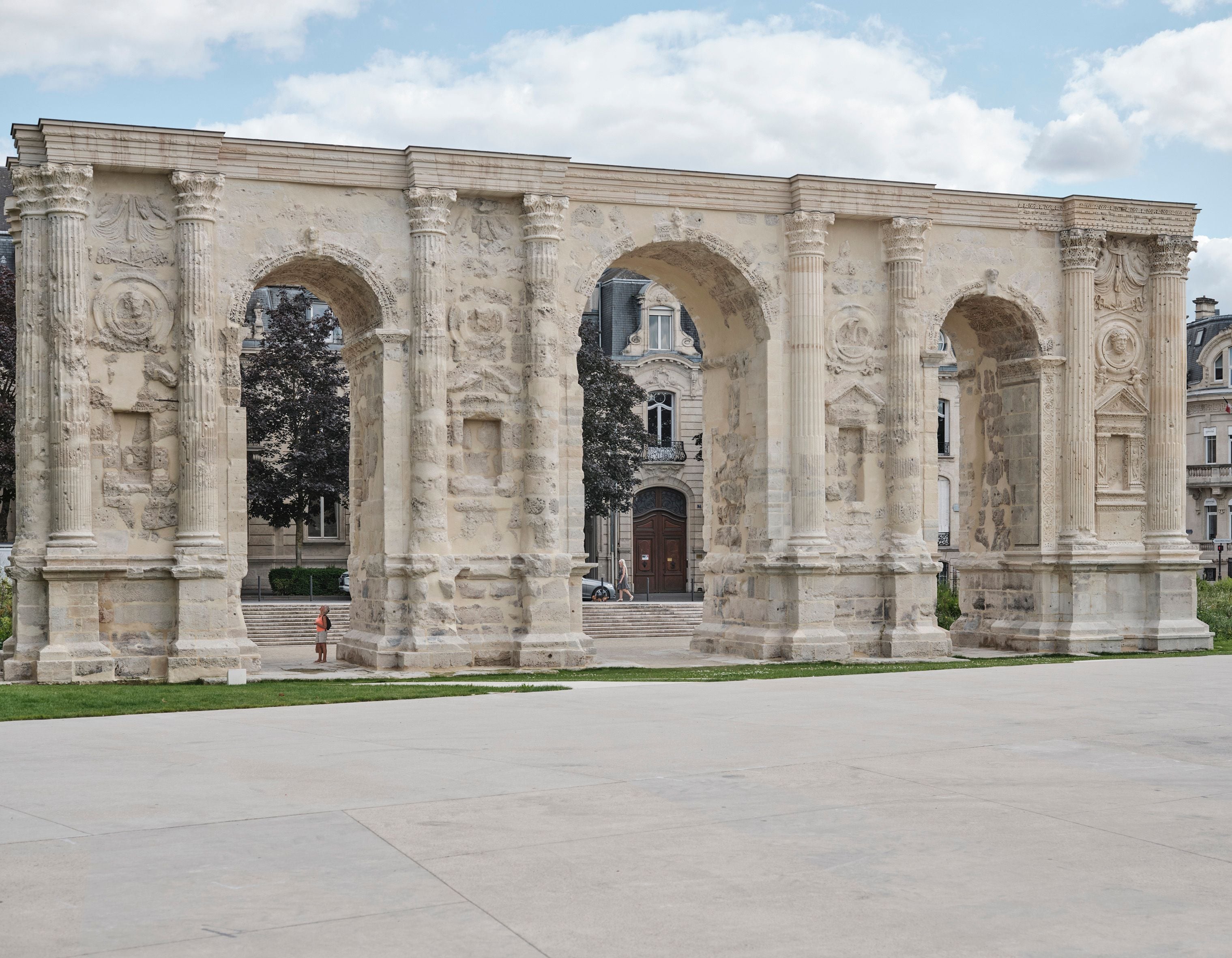 Construite au début du IIe siècle de notre ère, la Porte de Mars est un exemple de construction monumentale romaine reproduite dans chaque territoire conquis. À fois symbolique et fonctionnel, l’édifice assoit la puissance de l’Empire romain et marque, au moment de sa construction, l’entrée nord de Durocotorum, l’actuelle ville de Reims. Modifiée par les campagnes de construction qui transforment la cité au fil des siècles, la Porte de Reims est intégrée dans les enceintes successives de la ville dès le Bas-Empire. Redécouverte au début du XVIIe siècle, la porte de Mars est progressivement mise au jour. Classée Monument Historique dès 1840, la porte est restaurée et complétée à l’Ouest par l’architecte de la Ville Narcisse Brunette dans les années qui suivent. Protégée par une dalle de ciment à la fin du XIXe siècle, la porte se dégrade durant le XXe siècle et une vaste campagne de restauration est engagée dans les années 2010. Cette dernière débute par la création d’une architrave et la mise en œuvre d’une couverture en plomb pour être suivie par la restauration des élévations.